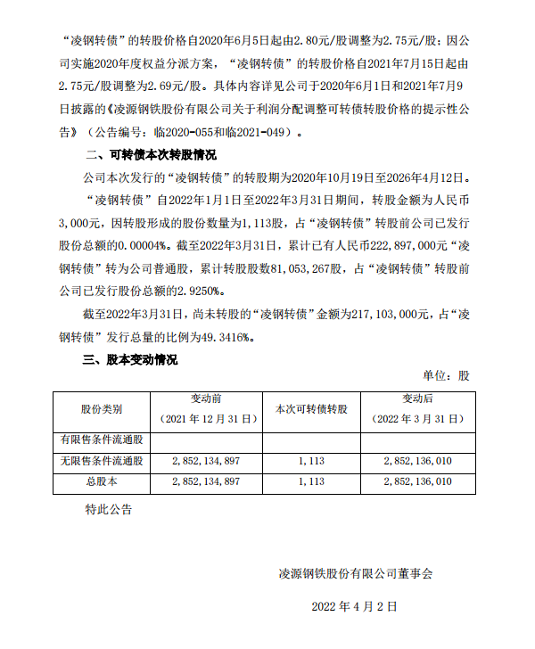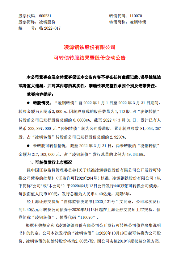 淩源鋼鐵股份有限公司可轉債轉股結果暨股份變動公告