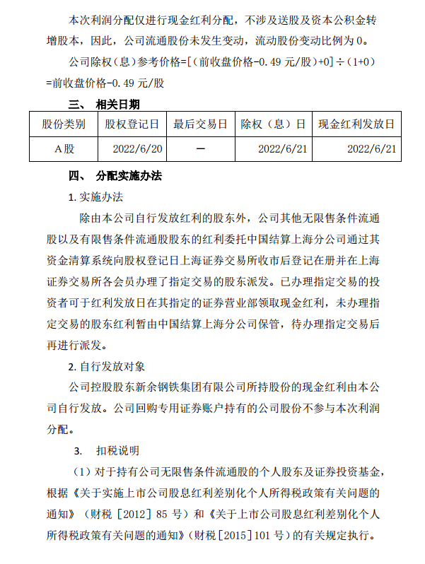 新鋼股份2021年度權益分派實施公告