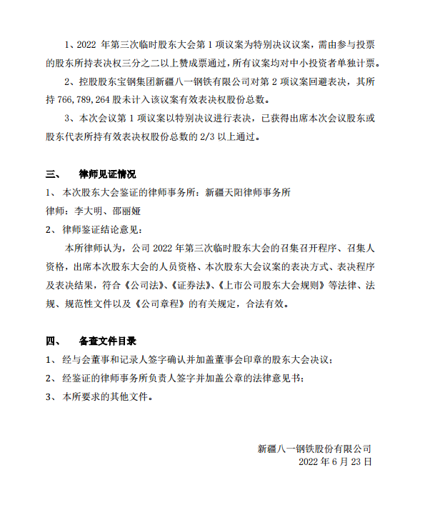 新疆八一鋼鐵股份有限公司2022年第三次臨時股東大會決議公告