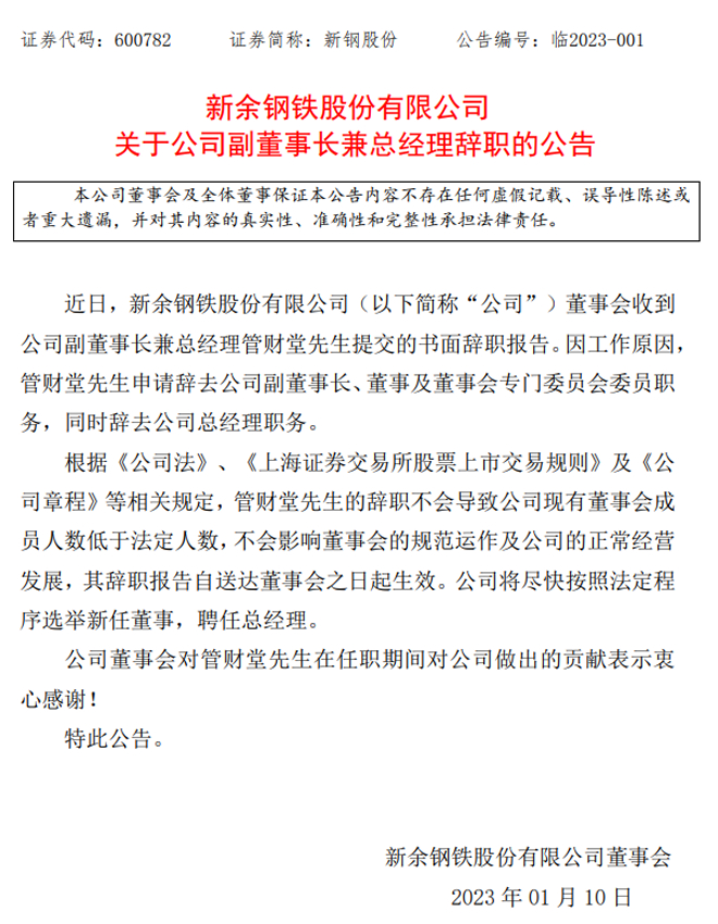 新鋼股份:新鋼股份關於公司副董事長兼總經理辭職的公告