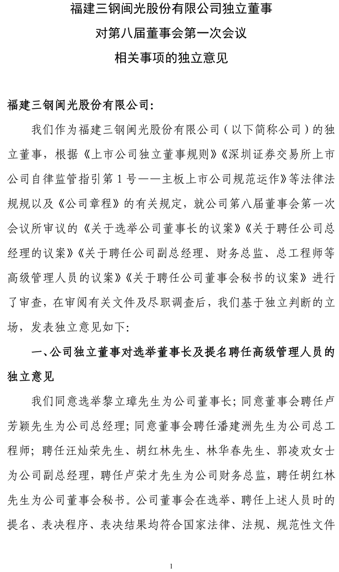 三鋼閩光:獨立董事對第八屆董事會第一次會議相關事項的獨立意見