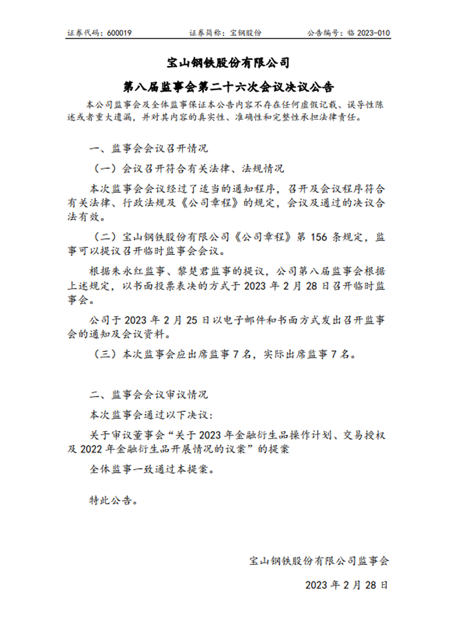 寶鋼股份:寶鋼股份第八屆監事會第二十六次會議決議公告