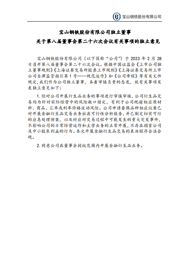 寶鋼股份:寶鋼股份獨立董事關於第八屆董事會第二十六次會議有關事項的獨立意見