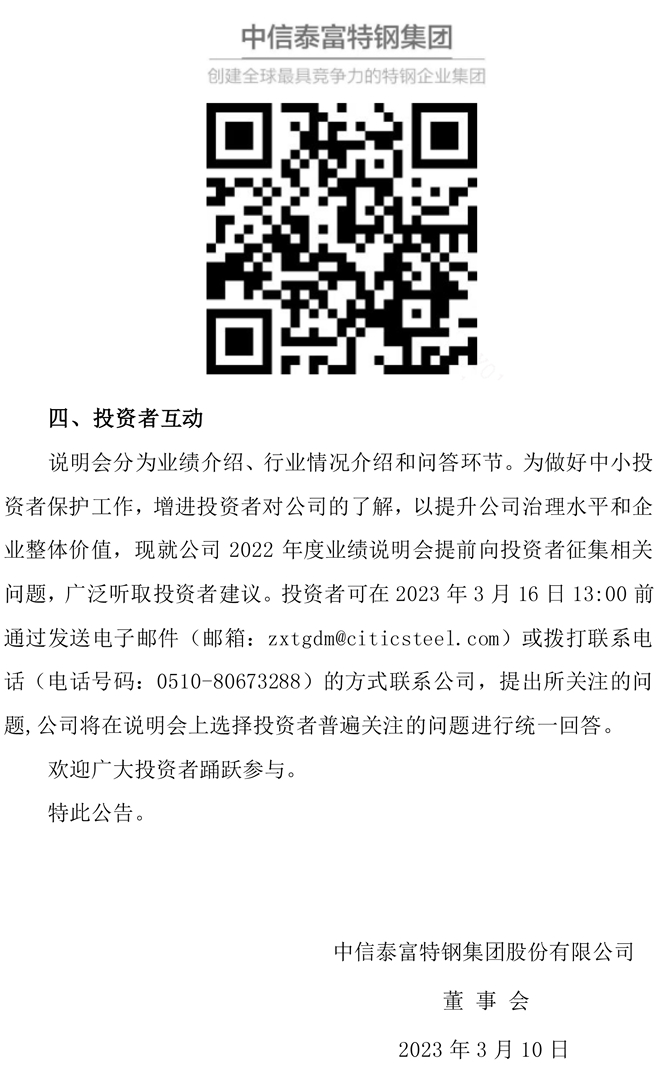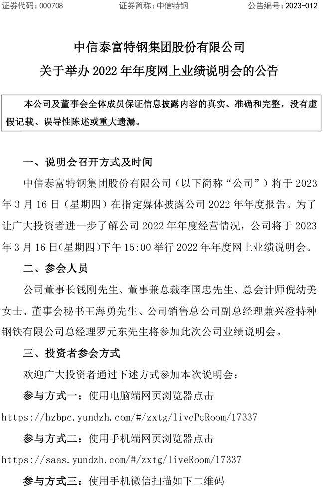 中信特鋼:關於舉辦2022年年度網上業績說明會的公告