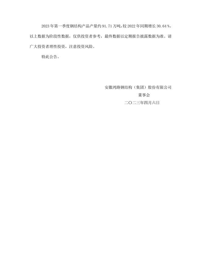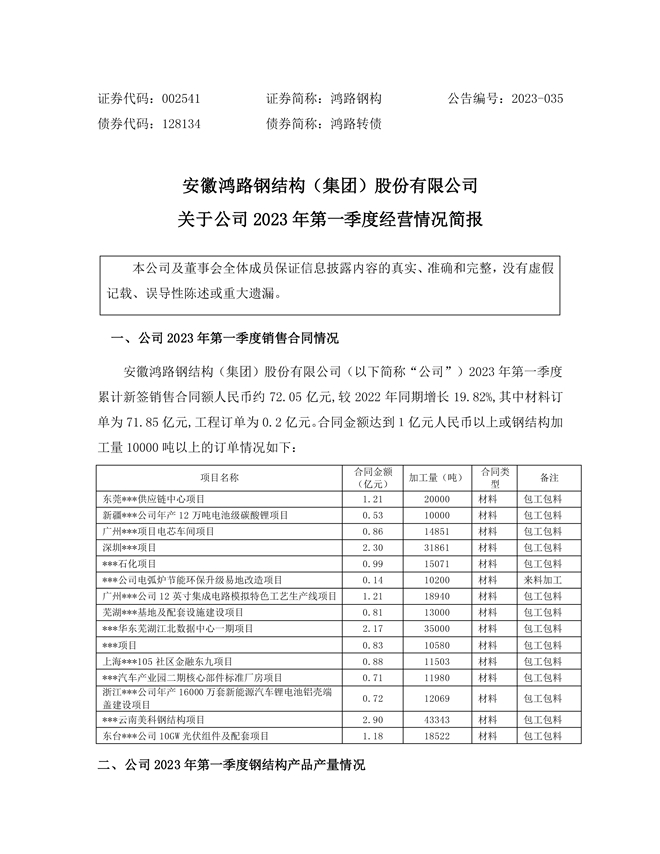 鴻路鋼構:關於公司2023年第一季度經營情況簡報