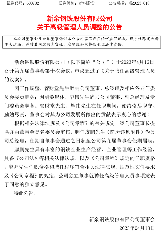 新鋼股份:新鋼股份關於高級管理人員調整的公告