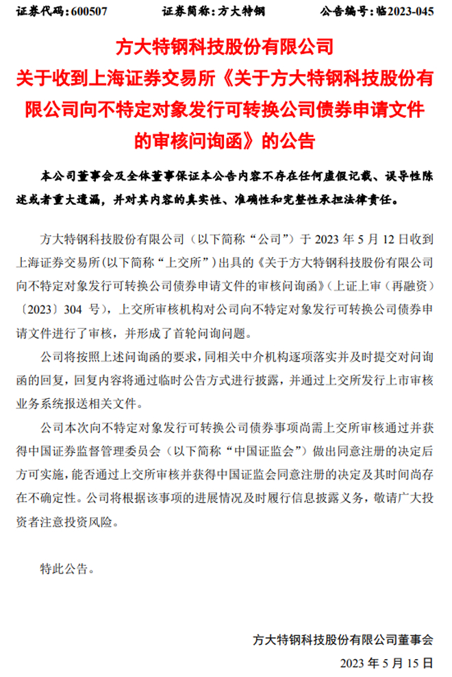 方大特鋼:方大特鋼關於收到上海證券交易所《關於方大特鋼科技股份有限公司向不特定對象發行可轉換公司債券申請文件的審核問詢函》的公告