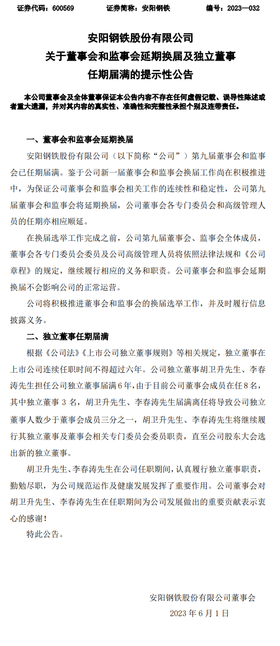 安陽鋼鐵:安陽鋼鐵股份有限公司關於董事會和監事會延期換屆及獨立董事任期屆滿的提示性公告