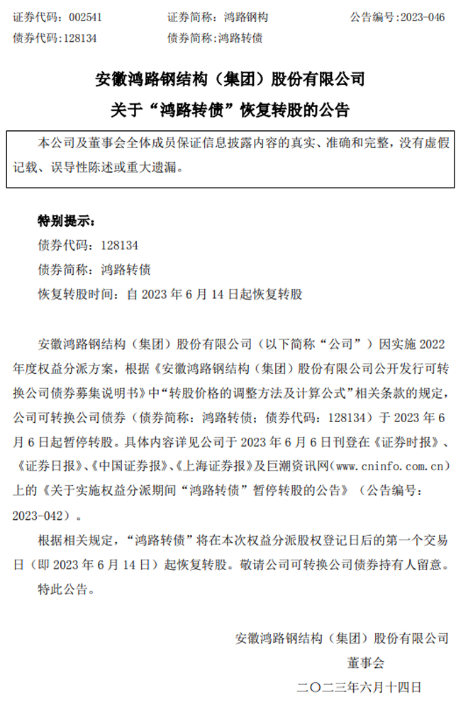 鴻路鋼構:關於鴻路轉債恢複轉股的公告