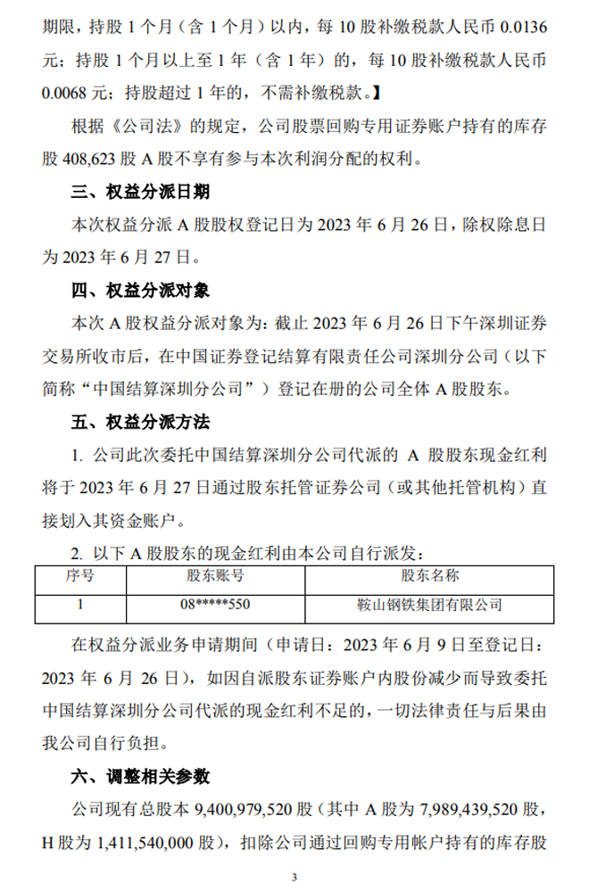 鞍鋼股份:鞍鋼股份2022年度A股權益分派實施公告