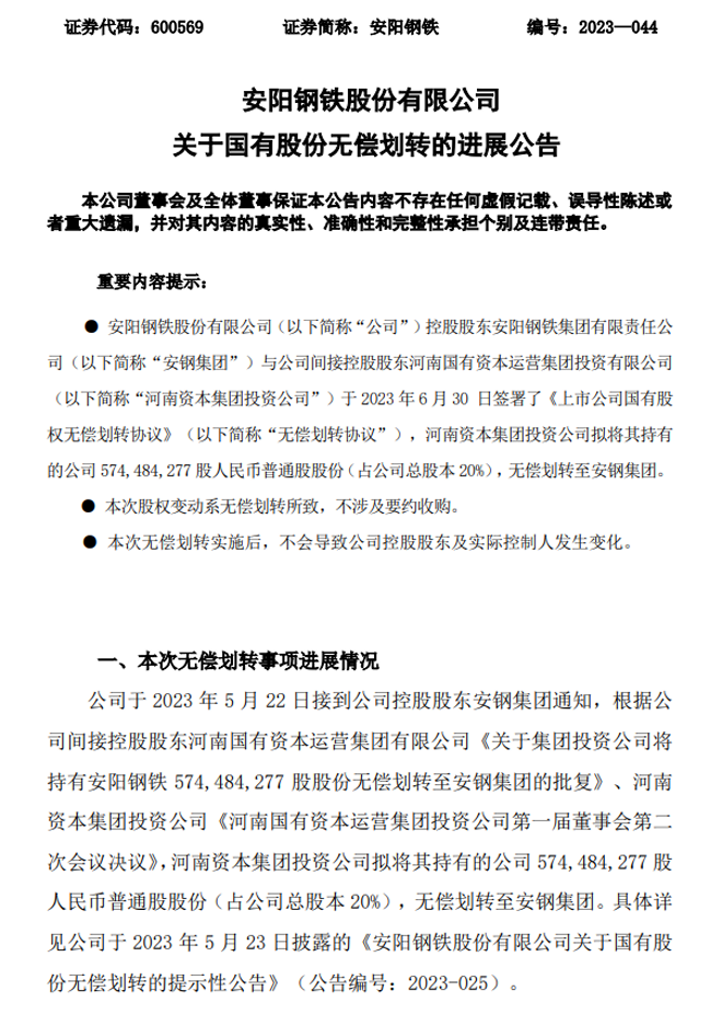 安陽鋼鐵:安陽鋼鐵股份有限公司關於國有股份無償劃轉的進展公告