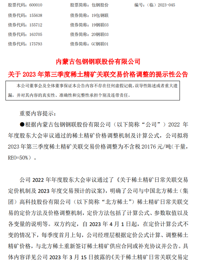 包鋼股份:包鋼股份關於2023年第三季度稀土精礦關聯交易價格調整的提示性公告