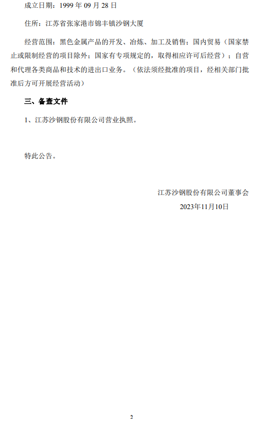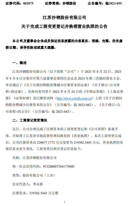 沙鋼股份:關於完成工商變更登記並換領營業執照的公告