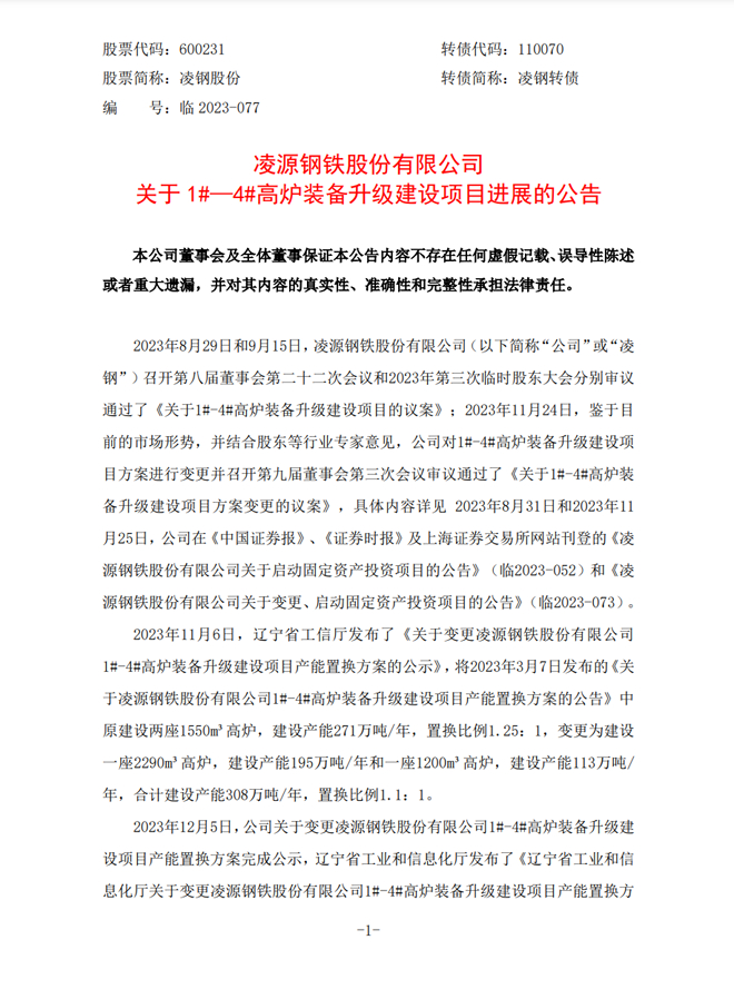 淩鋼股份:淩源鋼鐵股份有限公司關於1#—4#高爐裝備升級建設項目進展的公告