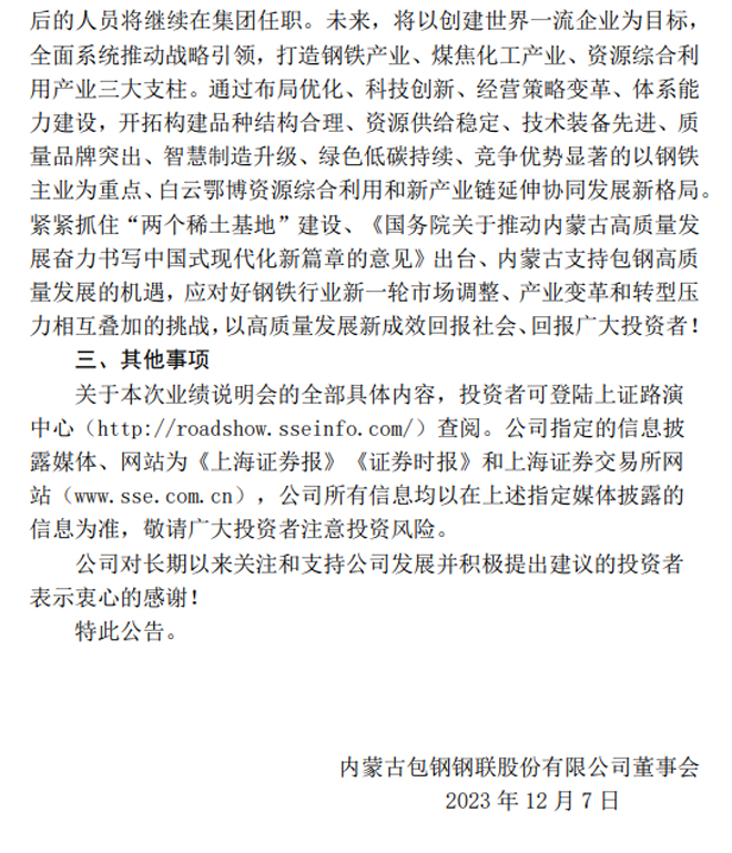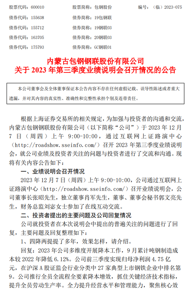 包鋼股份:包鋼股份關於2023年第三季度業績說明會召開情況的公告
