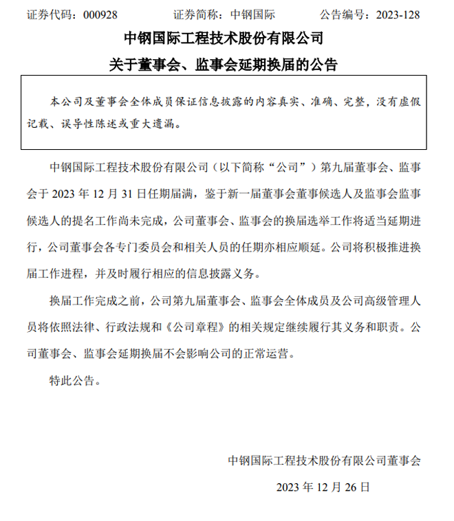 中鋼國際:關於董事會、監事會延期換屆的公告