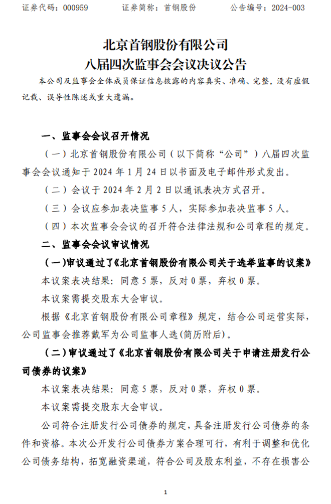 首鋼股份:北京首鋼股份有限公司八屆四次監事會會議決議公告
