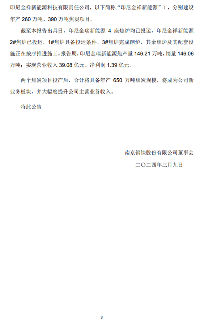 南鋼股份:南京鋼鐵股份有限公司關於2023年第四季度主要經營數據的公告