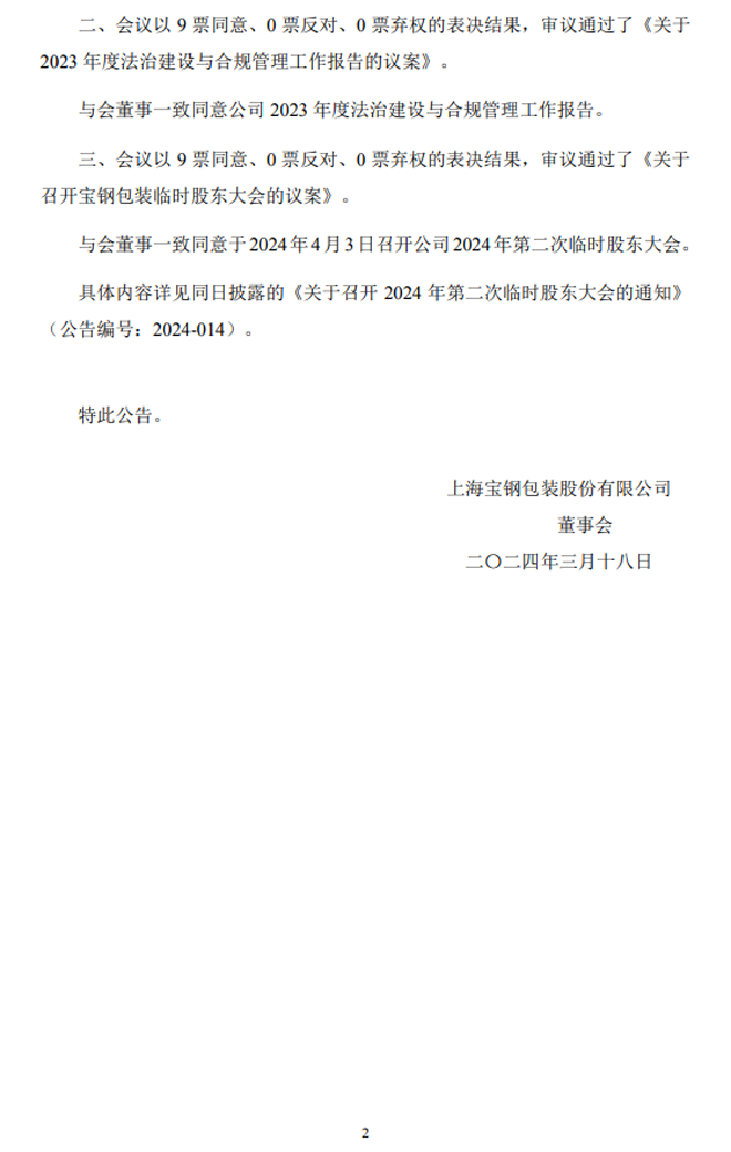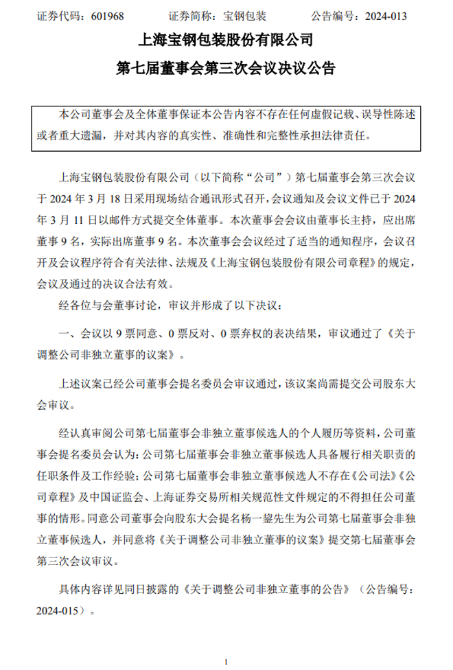 寶鋼包裝:第七屆董事會第三次會議決議公告