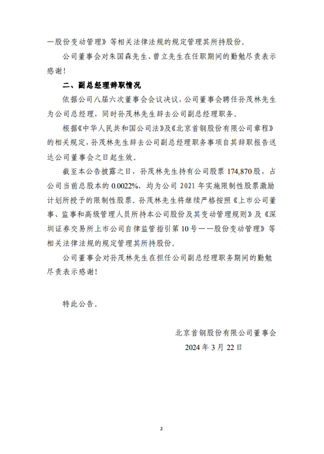 首鋼股份:北京首鋼股份有限公司關於董事、高級管理人員辭職的公告