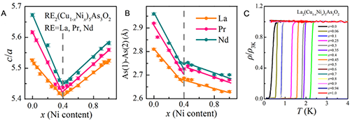 最近,中國科學院物理研究所/北京凝聚態物理國家研究中心先進材料與結構分析實驗室A02組博士生陳旭在郭建剛副研究員和陳小龍研究員的指導下,與物理所胡江平研究員、張慶華副研究員和複旦大學李世燕教授等合作,首次製備出新型CuAs基超導體係RE 2 Cu 5 As 3 O 2 (RE=La, Pr, Nd),其中[La 2 O 2 ] 2 層為載流子庫層,[Cu 5 As 3 ] 2- 為超導物性決定層,其結構不同於[Fe 2 X 2 ] 2- (X=As, Se)層,如圖1A所示。在[Cu 5 As 3 ] 2- 層中,存在強的As-As共價鍵,將兩個反螢石型的[Cu2As 2 ] 2- 層連接起來,如圖1B所示。密度泛函理論計算表明,RE 2 Cu 5 As 3 O 2 費米能級處的能態主要來源於Cu(1)的3 d 和As(1)的4 p 電子,Cu(2)的電子態貢獻較少。低溫測試表明La 2 Cu 5 As 3 O 2 和Pr 2 Cu 5 As 3 O 2 的電阻率在80 K和40 K分別出現了上翹現象,這可能與某種有序相變密切相關,如圖1C所示。對Cu原子進行Ni摻雜,發現摻雜量為40%時,RE 2 Cu 5 As 3 O 2 的 c / a 和As-As共價鍵發生了異常變化,如圖2A和2B所示。極低溫電學測試表明,La 2 (Cu 1- x Ni x )As 3 O 2 的 T c 隨Ni摻雜量增多呈現先增大後減小的行為,最大值(T c =2.5 K)出現在40% Ni摻雜量的樣品中,如圖2C所示。同時,對於非超導的Pr 2 Cu 5 As 3 O 2 和Nd 2 Cu 5 As 3 O 2 ,Ni摻雜能夠有效地誘導出超導,T c 也呈現先增後減的趨勢。圖3是RE 2 Cu 5 As 3 O 2 的超導電子相圖,可以看出在La 2 (Cu 1- x Ni x )As 3 O 2 中,當摻雜量較低時,存在兩相競爭和共存的區域。在中等摻雜量時,RE 2 (Cu 1- x Ni x )As 3 O 2 的 T c 均呈現dome形狀的變化趨勢,最高的 T c 都對應著40%的Ni摻雜量。在高摻雜量時,體係出現了四方到正交的結構相變。
