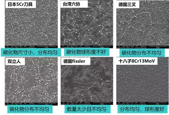 下圖為與國外高品質廚刀顯微組織對比,鋼中的碳化物細小、彌散,達到甚至超過國際先進水平。