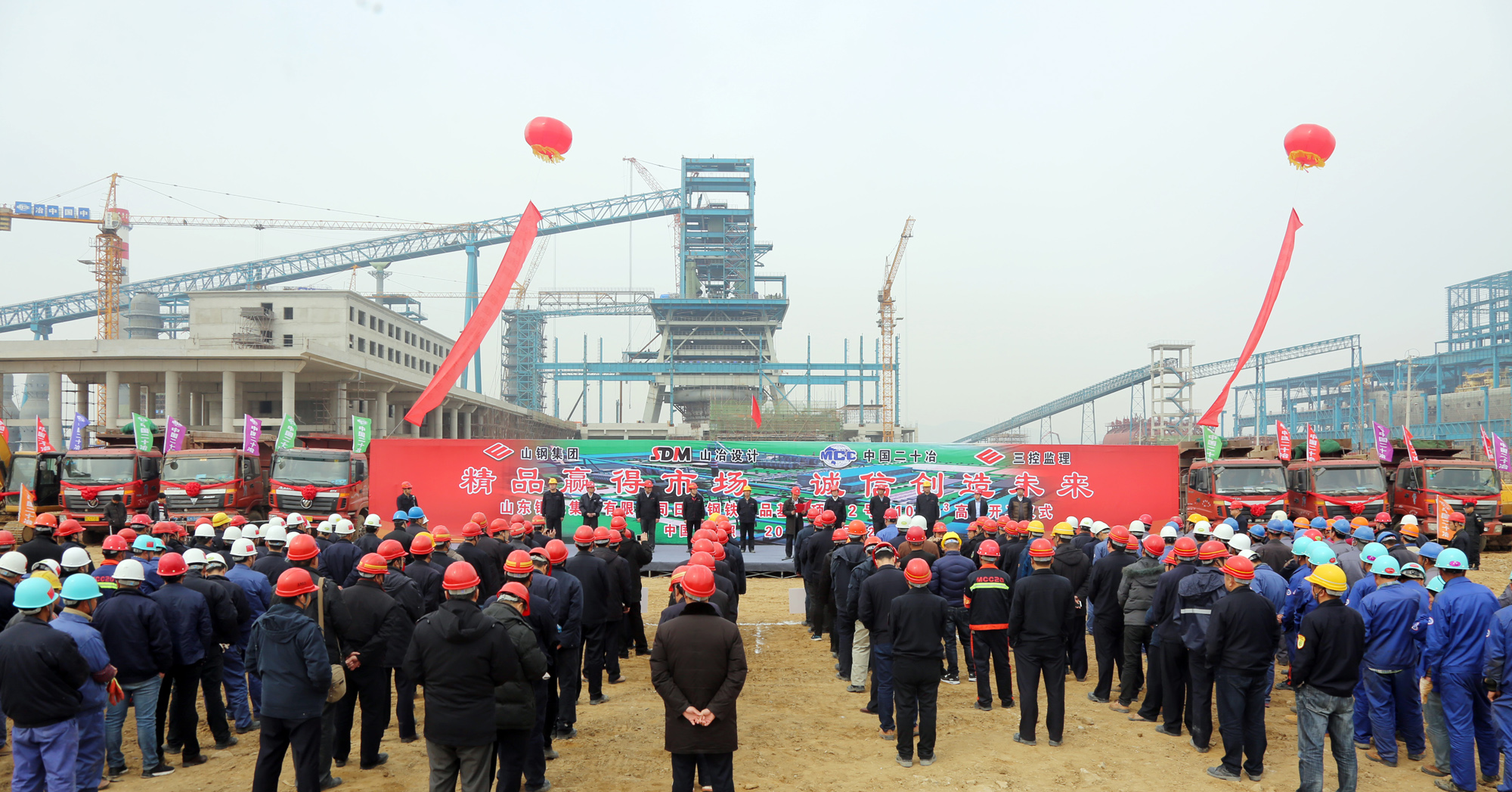 3月22日10時16分,2號5100m3高爐開工儀式舉行(如圖)。一期二步2號(hao)高(gao)爐(lu)正(zheng)式(shi)開(kai)工(gong)建(jian)設(she)對(dui)於(yu)早(zao)日(ri)全(quan)麵(mian)建(jian)成(cheng)建(jian)好(hao)精(jing)品(pin)基(ji)地(di),落(luo)實(shi)山(shan)鋼(gang)集(ji)團(tuan)轉(zhuan)型(xing)發(fa)展(zhan)戰(zhan)略(lve)定(ding)位(wei)具(ju)有(you)重(zhong)要(yao)意(yi)義(yi)。據(ju)悉(xi),日(ri)照(zhao)鋼(gang)鐵(tie)精(jing)品(pin)基(ji)地(di)一(yi)期(qi)建(jian)設(she)規(gui)模(mo)為(wei)兩(liang)座(zuo)5100m3高爐,兩座高爐對稱布置,年產生鐵810萬噸。1號5100m3高爐已於2015年9月16日開工建設。目前,1號5100m3高爐上料係統主皮帶機通廊工程順利完工,高爐本體施工至88米,各項工程正按照網絡計劃節點高效推進,扣網運行。(郭陽 攝)