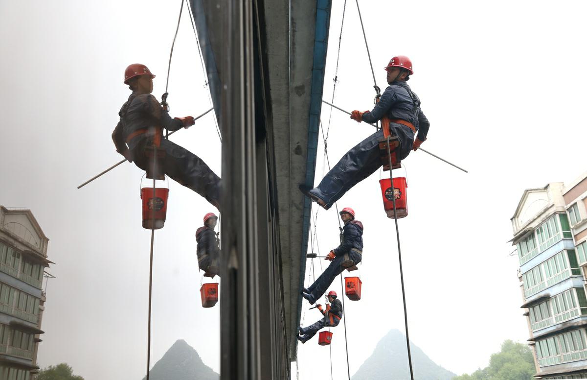 自首鋼水鋼打造“花園式工廠”以來,水鋼博宏公司d大力開展現場文明生產、環境綠化美化等工作,進一步改善了廠區環境和企業形象。圖為5月6日,該公司組織人員對辦公樓的外牆和玻璃進行清洗,打造清潔的辦公環境。(熊鋒 攝)
