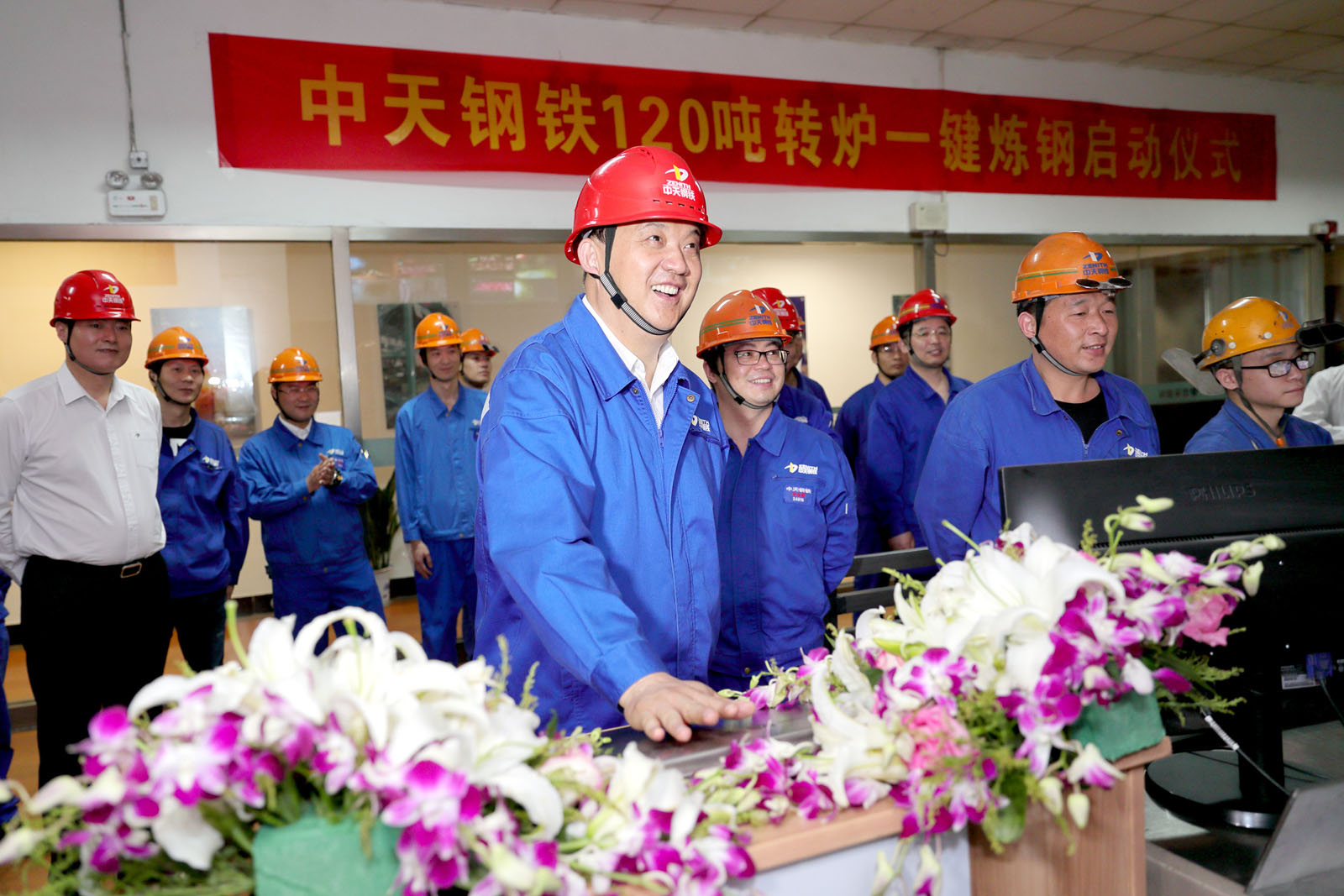 5月15日,中天鋼鐵集團3號(hao)轉(zhuan)爐(lu)一(yi)鍵(jian)式(shi)自(zi)動(dong)化(hua)煉(lian)鋼(gang)成(cheng)功(gong)啟(qi)動(dong)。該(gai)技(ji)術(shu)攻(gong)克(ke)了(le)轉(zhuan)爐(lu)冶(ye)煉(lian)環(huan)節(jie)智(zhi)能(neng)化(hua)控(kong)製(zhi)難(nan)題(ti)。據(ju)悉(xi),采(cai)用(yong)一(yi)鍵(jian)式(shi)煉(lian)鋼(gang)技(ji)術(shu)能(neng)有(you)效(xiao)提(ti)高(gao)轉(zhuan)爐(lu)終(zhong)點(dian)命(ming)中(zhong)率(lv),同(tong)時(shi)每(mei)爐(lu)鋼(gang)可(ke)減(jian)少(shao)冶(ye)煉(lian)周(zhou)期(qi)約(yue)2分鍾,全年就可多冶煉近13萬噸鋼水,年增加經濟效益7200萬元,減少粉塵排放5%。此外,采用該技術後,產品質量更加穩定,煉鋼基礎管理和自動化、信息化水平亦將得到有效提升。圖為中天鋼鐵集團董事局主席、總裁、黨委書記董才平按鍵啟動一鍵式自動化煉鋼。(陳明 攝)