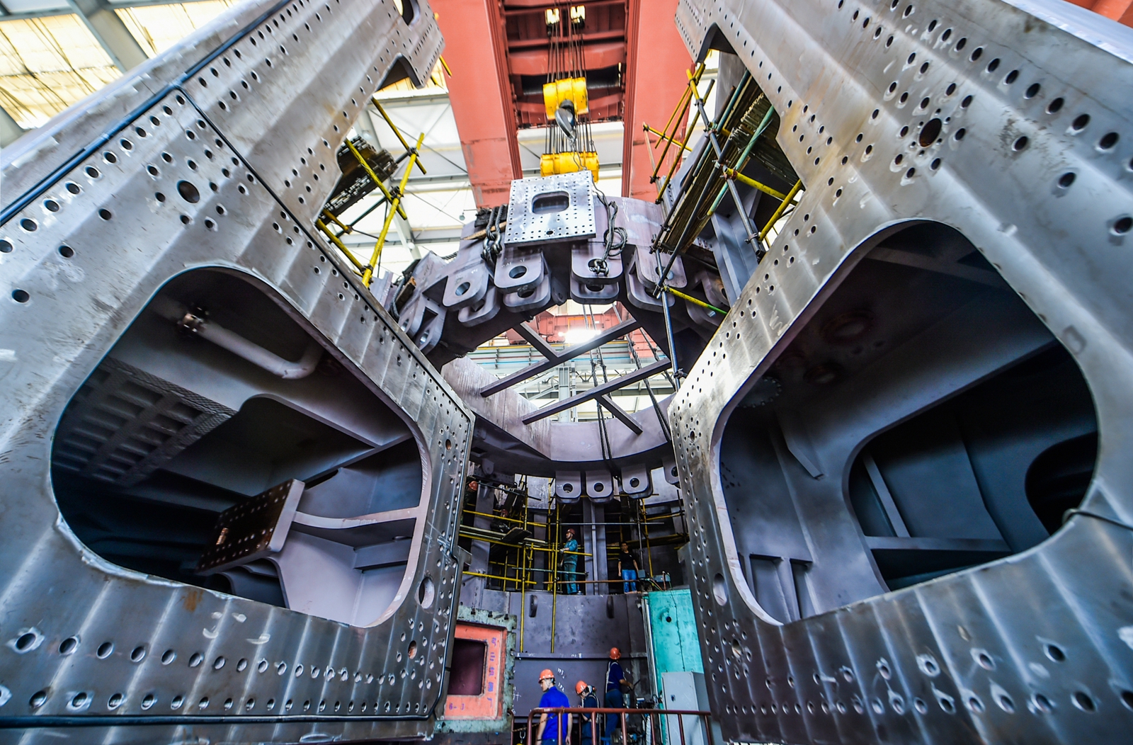 6月26日,由中信重工與中鐵工程裝備集團聯合製造的國內最大、總重4000餘噸、直徑15.03米的氣墊式泥水盾構機,進入機械部分盾體裝配階段(如圖)。據悉,該盾構機具有我國自主知識產權,且超高承壓能力係統集成、伸縮擺動式刀盤等多項技術已達到國際領先水平,將應用到廣東省汕頭海灣隧道交通工程中。(特約通訊員 黃政偉 攝 )