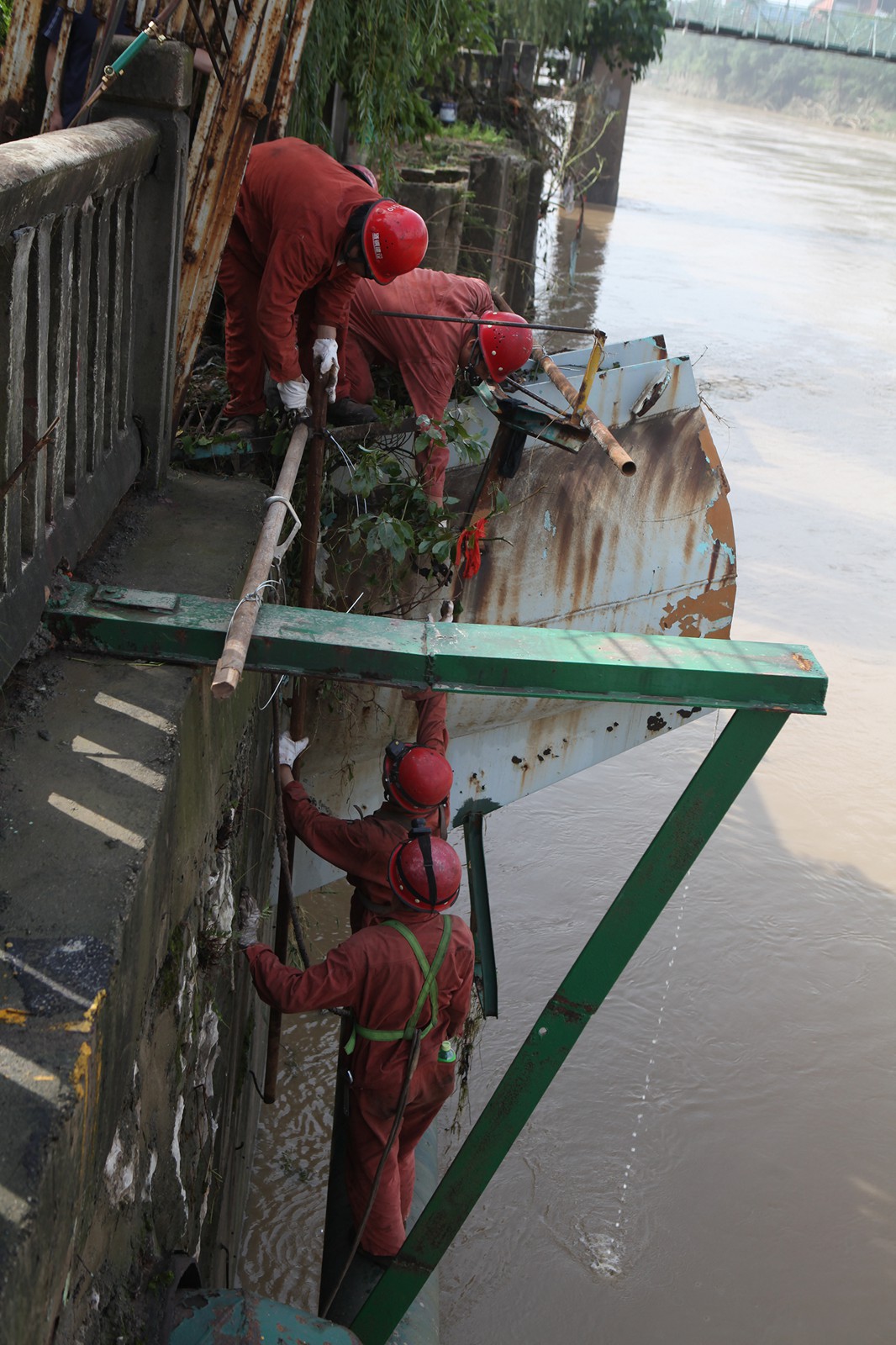 圖為洪峰過後,華菱漣鋼快速組織搶修受損的煤氣管道。(記者 柳琴聲 通訊員 孫遠平 羅興伍 攝)