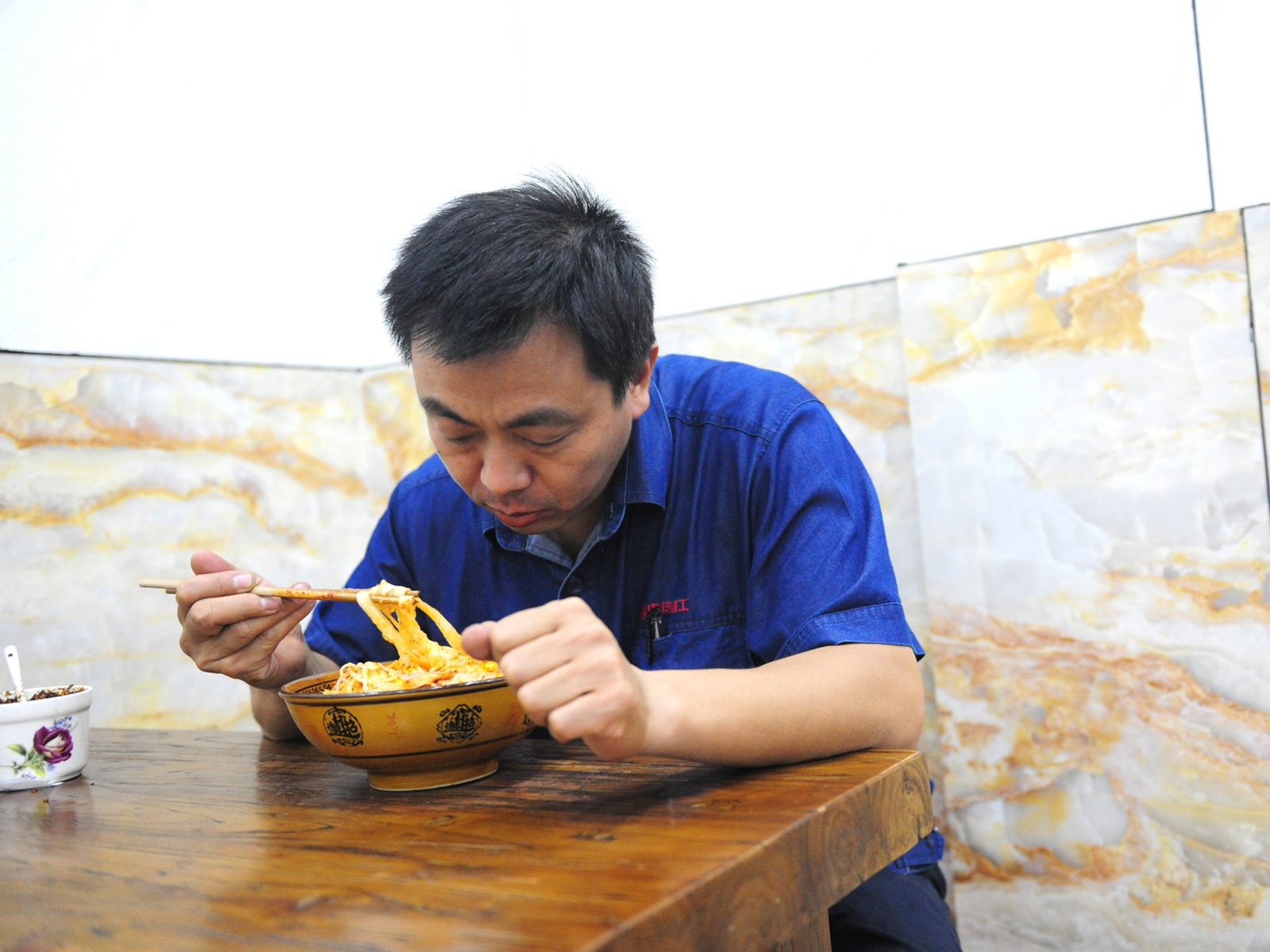 圖六:身為大班長的劉新安,加班是常有的事,每每遇到加班,他都是在公司門口的小餐館吃一碗油潑麵。