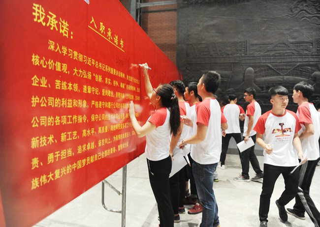 9月1日下午,鞍山鋼鐵舉辦2017年新職工入職儀式。在鞍鋼集團博物館“鋼鐵之魂”浮雕前,227名身著鞍鋼標誌文化衫的新職工正式入職,成為鞍鋼這個大家庭中的一員,從這裏開始他們職業生涯的第一課。據悉,從2015年起鞍山鋼鐵開始為新入廠職工舉辦入職儀式,每次入職儀式全程影像資料、每人親手簽名的《入職承諾書》,以及每名新職工的照片、全體合影等,都將存入鞍鋼集團博物館,永久收藏。圖為新職工正在《入職承諾書》上簽字。(特約通訊員 張明傑 通訊員 高洋洋 攝)