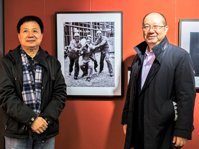 圖為於文國(左一)正向陸聞言一行介紹攝影展上的作品。