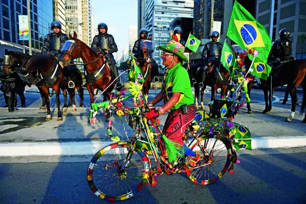 2014年巴西世界杯,一位球迷經過交通管製的保利斯塔大街。(作者:EITAN ABRAMOVICH)