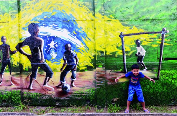 2014年6月,聖保羅一處塗鴉牆前快樂的男孩兒。(作者:胡金喜 )