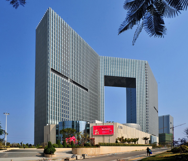 1月28日,由中國五冶承建的廈門國貿金融中心正式開門迎客。據悉,該廈門國貿金融中心工程,是集辦公、商業等功能為一體的超高層建築綜合體,總建築麵積近26萬平方米,占地麵積2.43萬平方米,高約140米。圖為“門”字建築造型的國貿金融中心外景。(王晨輝 攝)
