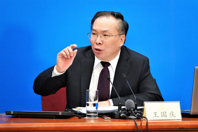 新聞發言人王國慶回答中外記者提問。