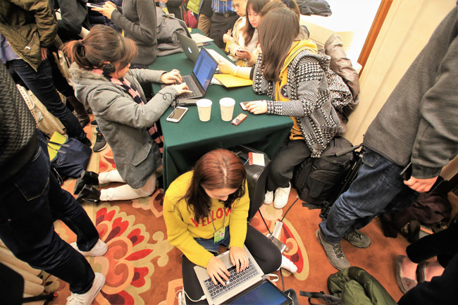 後排的記者席地而坐,在有限的空間下進行會議報道。