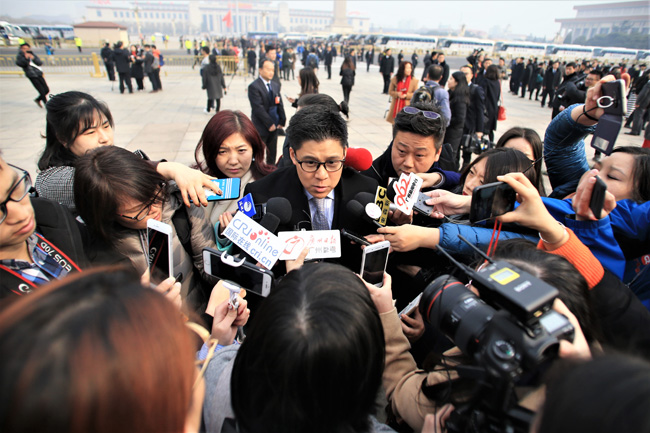 劉永好委員在步入會場前正在接受媒體采訪。
