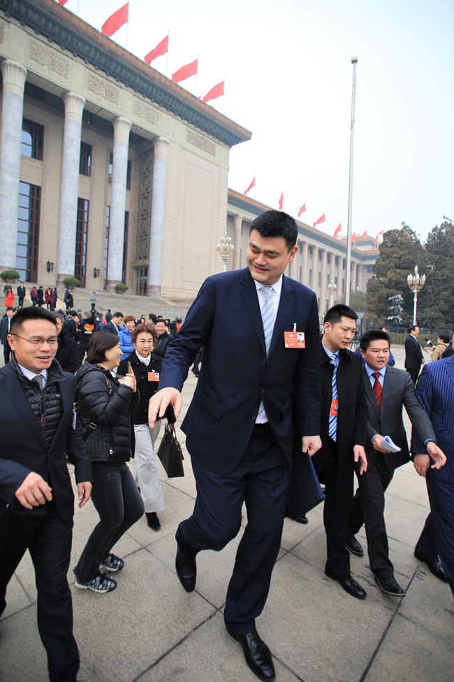 又到新一年的兩會時間,新老朋友見麵格外親切,圖為姚明委員正在向其他委員打招呼。