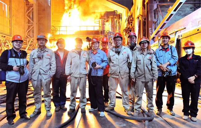 10月1日,山鋼股份萊蕪分公司特鋼事業部工會組織十餘名職工攝影家下車間、進現場、到崗位。把鏡頭對準了奮戰在生產一線的勞動者,拍攝下一幅幅他們忘我拚搏、無私奉獻的精彩瞬間。和勞動者們一起在火熱的作業崗位上,慶祝祖國的生日。圖為攝影家和煉鋼工在電爐前合影並祝福祖國。 (特約通訊員 王啟東 攝)