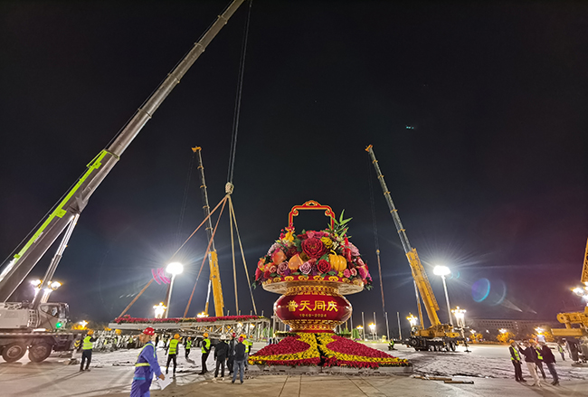 9月23日清晨,經過數個晝夜的奮戰,天安門廣場“祝福祖國”巨型花籃吊裝完成,再次完美盛放(如圖)。首鋼連 續17年承擔天安門國慶主題景觀花籃的製作安裝任務。據了解,天安門巨型花籃鋼結構總量245噸,采用裝配式鋼結構。花籃底部直徑45米,為花卉構成的如意圖案,寓意吉祥如意、國泰民安。籃身為玻璃鋼結構,可抗10級風。整體花籃頂高18米,籃盤直徑12米,自下而上由坡麵花壇、玻璃鋼籃肚、玻璃鋼籃盤和籃芯組成。今年的大花籃以蔬果為主題,選取了美好寓意的葫蘆、石榴、桃子、南瓜、辣椒等蔬菜水果,搭配“花中四君子”梅蘭竹菊及象征繁榮昌盛的牡丹花等花卉,有“蔬果飄香 繁花似錦”之意,表達對祖國繁榮富強、欣欣向榮的美好祝福。(張朔 攝)
