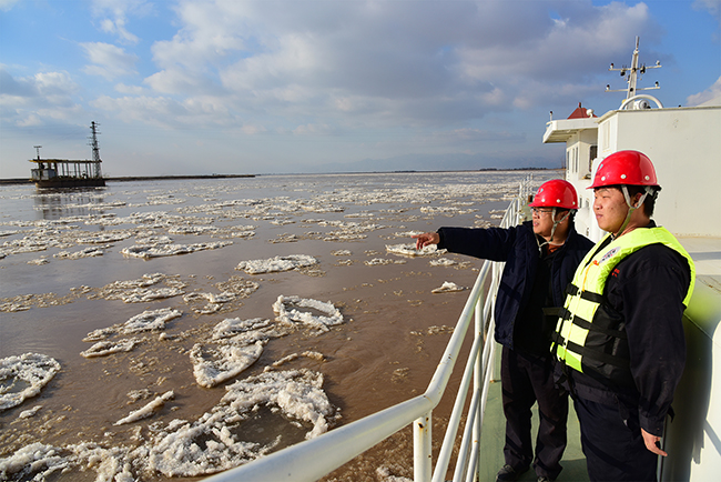 12月5日,受強冷空氣影響,包鋼水源地——黃河昭君墳段主河道出現流淩,該段主河道流淩密度達到20%左右,流量達911立方米/秒,首淩日期較去年偏晚5天。包鋼鑫能公司密切關注河道流淩變化情況,同時做好流淩期間的各項應對準備工作,確保流淩期間取水設備、設施的安全,保證廠區安全穩定供水。圖為鑫能公司水文站職工正在查看主河道流淩情況。(申海俊/文白立新/攝)