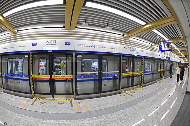 2月22日,山西太原地鐵1號線正式開通運營。據悉,太原地鐵1號線28列客車車體結構、麵板和輪軸鋼全部由太鋼供貨,不鏽鋼供貨量近1200噸。該地鐵線路的開通搭建起“空鐵軌交”無縫銜接的立體交通網絡,進而實現火車站、機場間的無縫換乘,太原軌道交通邁入“換乘時代”。圖為太原地鐵1號線在大南門站發車現場。(記者王旭宏攝)