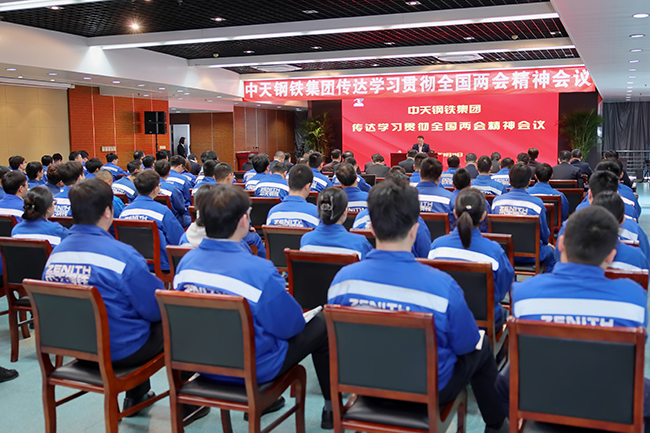 3月13日,第十四屆全國人大代表,中天鋼鐵集團董事局主席、總裁、黨委書記董才平在圓滿完成全國兩會履職任務後,返回工作崗位,並第一時間組織召開專題會議,傳達學習貫徹習近平總書記重要講話精神和全國兩會決策部署。通過學習,大家表示要錨定“十四五”規劃目標任務,堅定信心、實幹爭先,全力推動各項工作部署落到實處,切實把全國兩會政策紅利轉化為企業高質量發展實效。圖為會場。(王晶晶/文特約通訊員陳明/攝)