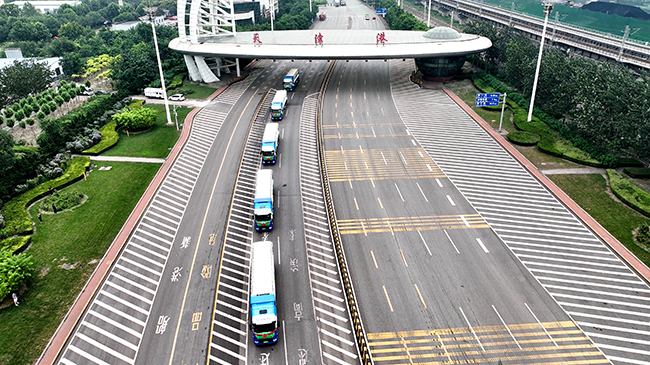 6月5日,榮程氫能重卡行駛在“天津港至邯鄲武安”氫能零碳運輸通道上(如圖)。今年初以來,榮程新能集團氫能零碳運輸線路覆蓋京津冀、山西、內蒙古、遼寧等區域,服務鋼鐵、化工、港口、礦山等領域的綠色轉型。截至今年5月底,榮程新能集團已累計投運氫燃料電池汽車800輛,投運加氫站12座,運輸貨物2738萬噸,行駛裏程為3890萬公裏。該集團依托氫能重卡的零碳運輸模式,已累計減少二氧化碳排放超過3.6萬噸。(劉迎昕 攝)