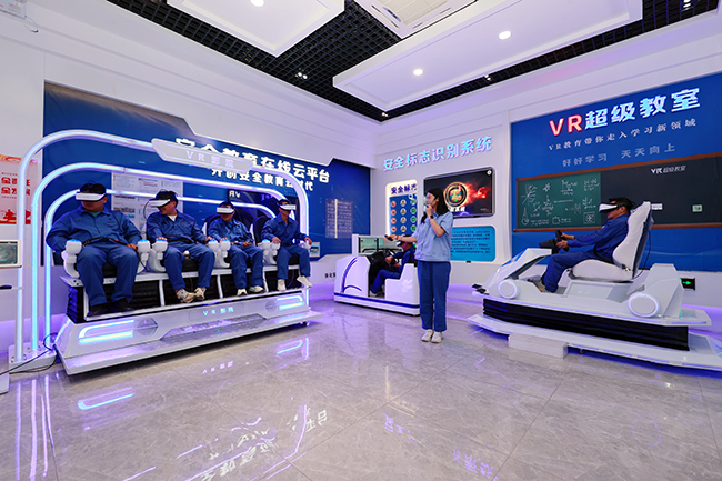6月13日,酒鋼集團西部重工公司VR智能體驗館裏,職工正在進行“虛擬動感沉浸式”體驗(如圖)。該體驗設備於6月份正式投用。體驗者佩戴VR(虛擬現實)頭顯即可進入虛擬環境,身臨其境地感受豐富多樣的VR內容,學習正確的應急避險和救援知識等,增強職工的安全意識,提高應急處置能力。在“安全生產月”期間,這一體驗活動成為體驗館的“人氣王”。(張誌芳 攝)
