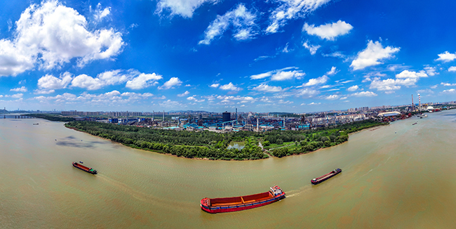 從2019年起,南鋼集團對沿長江岸線約3公裏、70萬平方米的江灘進行覆綠,種植垂柳、香樟、水杉等大型喬木15000多棵,並新建微馬跑道、音樂看台及棧橋等,全力打造濕地公園景觀。經過持續治理,現在的南鋼生態濕地園綠樹成蔭、草木繁茂,春有鮮花盛開,秋有蘆葦浩蕩,良好的生態環境吸引了20餘種候鳥棲息於此,遊客漫步綠色步道,可臨江觀賞長江沿岸的工業景觀,也可以巍巍煉鐵高爐為背景打卡拍照。圖為航拍南鋼生態濕地園。(特約通訊員 吳斌 攝)