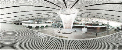 截至6月30日,北京大興國際機場各建設主體負責的主要工程項目均如期順利竣工,完工項目一次驗收合格率均達100%。大興國際機場工作重心從工程建設轉入準備投入運營。圖為北京大興國際機場航站樓內景(全景拚接照片)。新華社記者 才 揚攝